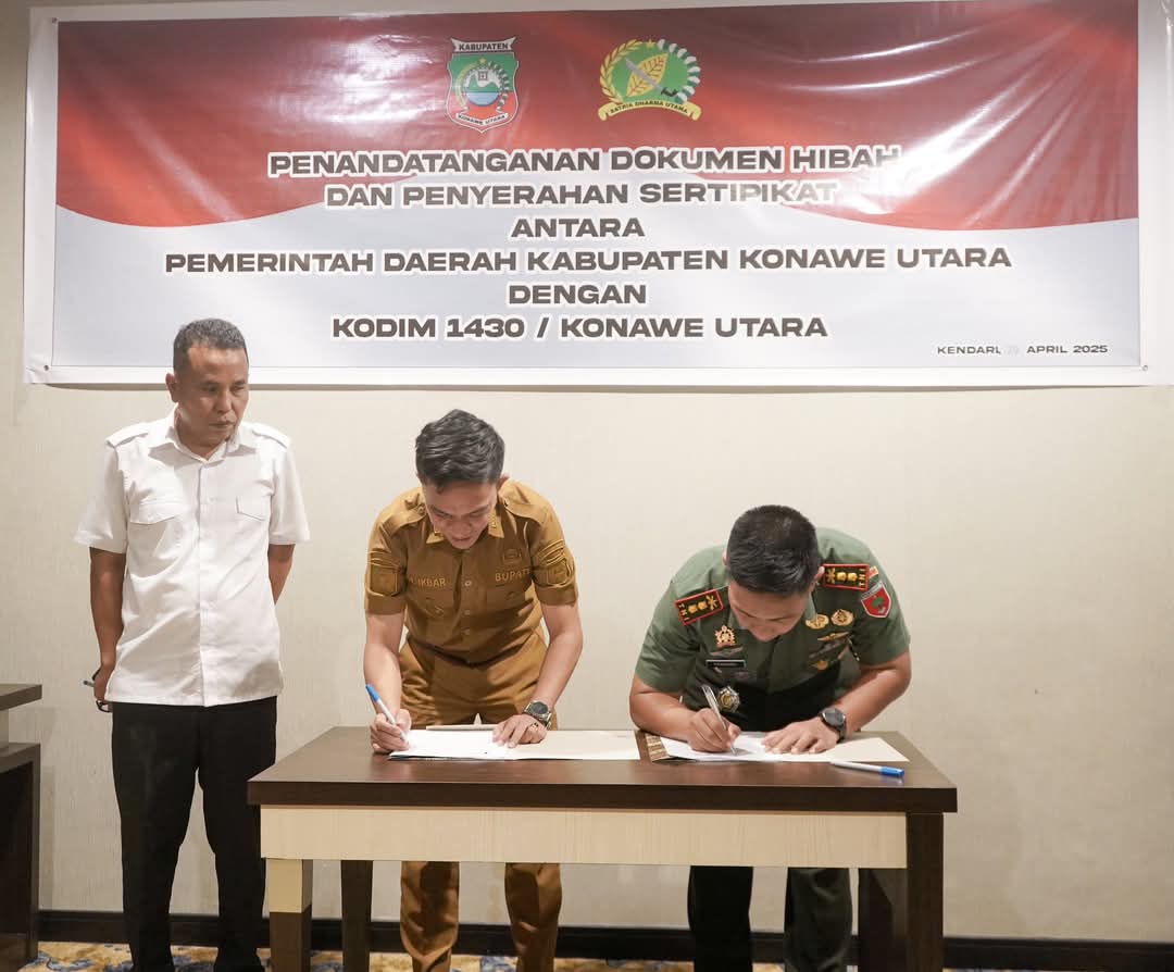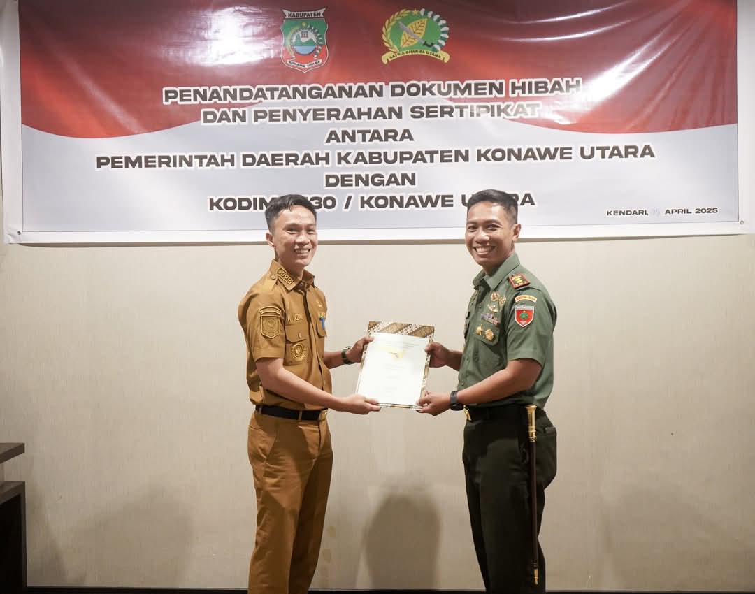 Kendari, bumikonaweutara – Pemerintah Kabupaten (Pemkab) Konawe Utara (Konut) secara resmi menyerahkan hibah tanah seluas 36.103 meter persegi kepada Komando Distrik Militer (Kodim) 1430 Konut. Penyerahan dilakukan langsung oleh Bupati Konut, H. Ikbar, SH, MH kepada Dandim 1430 Konut, Letkol Arh Pramono, S.Sos., M.Han.
