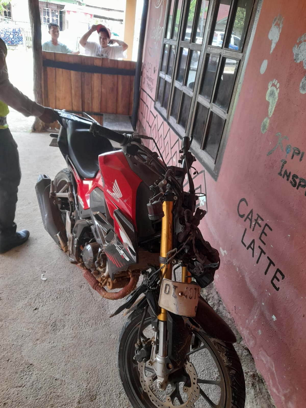 Karena jarak yang sudah terlalu dekat, pengendara Honda CB150 tidak mampu mengendalikan laju kendaraannya sehingga menabrak sepeda motor Yamaha Fino. Benturan keras tersebut menyebabkan pengendara Honda CB150 terpental hingga menabrak sisi deker di sebelah kanan jalan.