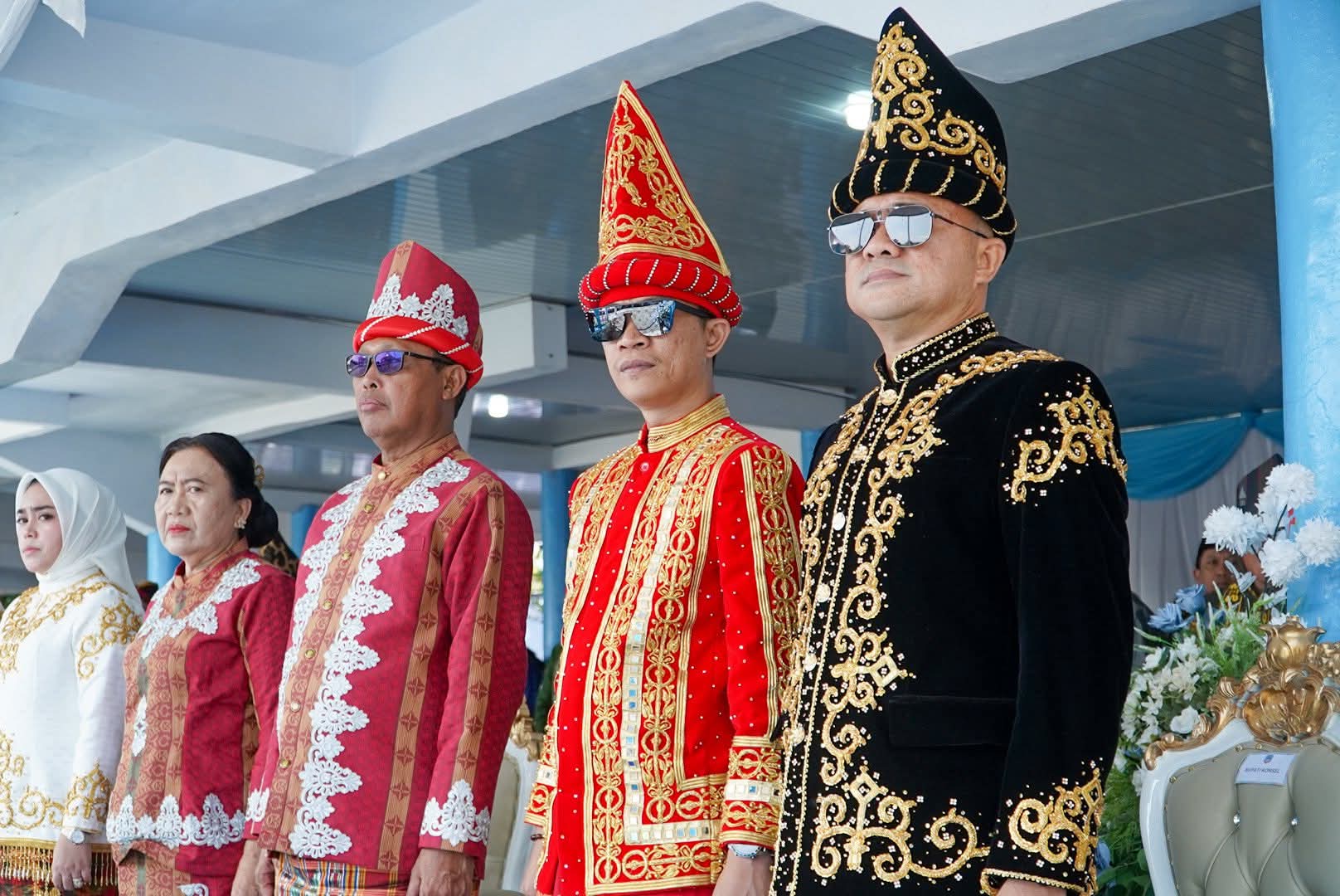 Ada yang menarik dari kehadiran orang nomor satu di Konawe Utara ini. Bupati H. Ikbar tampil memukau dengan mengenakan pakaian adat Tolaki berwarna merah yang dipadukan dengan sulaman benang emas yang elegan. Pilihan busana ini mencerminkan rasa bangga terhadap identitas budaya lokal sekaligus bentuk penghormatan bagi masyarakat Bumi Mekongga.