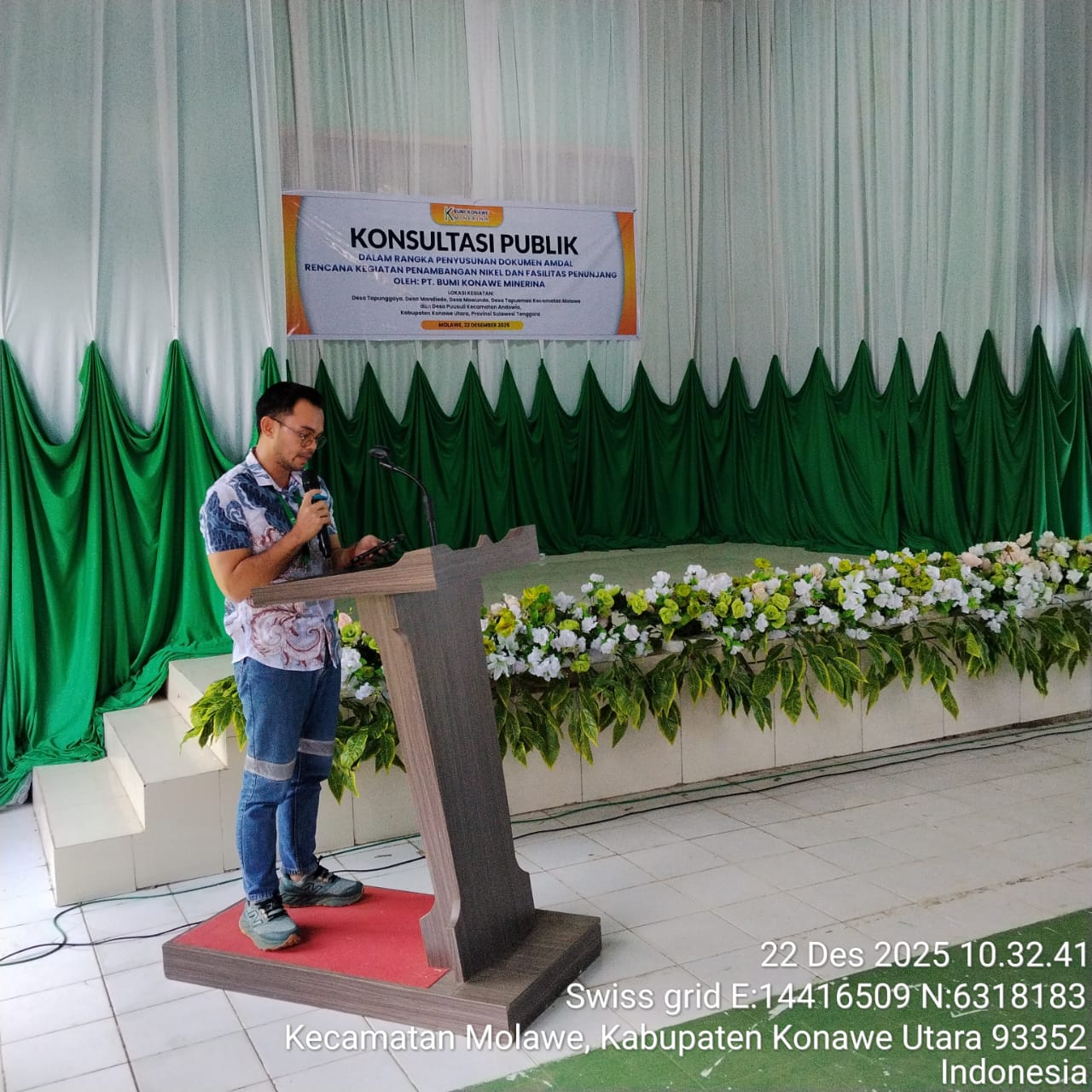 Molawe, bumikonaweutara – PT. Bumi Konawe Minerina bersama Konsultan, melaksanakan pertemuan konsultasi publik yaitu perubahan dokumen Analisis Dampak Lingkungan (Amdal) yang diselenggarakan di Aula Kanyor Camat Kelurahan Molawe Kecamatan Molawe, Kabupaten Konawe Utara, Sulawesi Tenggara pada Senin, 22 December 2025.